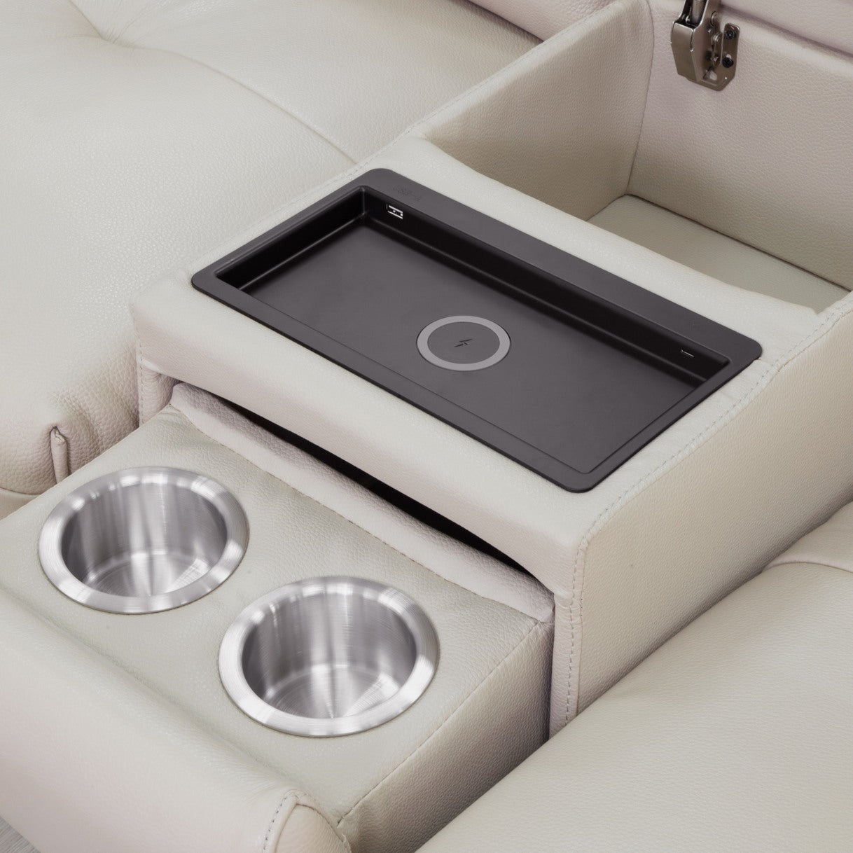 This 6-piece sectional includes two power motion beds, fitted with the Easyctrl mechanism for smooth, reliable reclining at the touch of a button, offering a full-body lounging experience. A smart console adds convenience with wireless charging, hidden cup holders, discreet storage, and USB-Type C ports on either side.