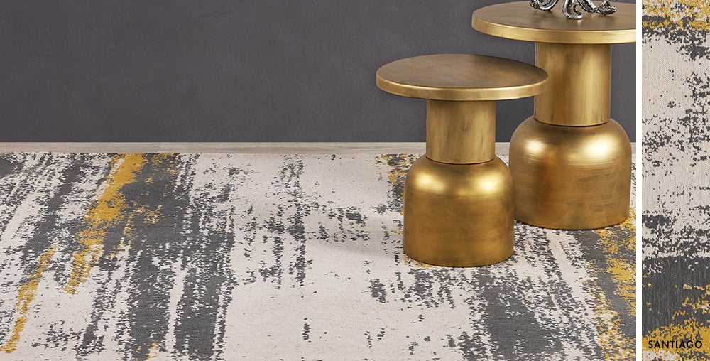 The soft textured Santiago rug features traces of a golden amber shade across a neutral stone-grey back tone. The elegant piece will be a suitable fit for modern living spaces.