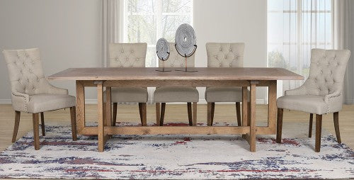 The Duchess Dining Chairs perfectly completes any Bolton Wood Top Dining Set. The Duchess Dining Chairs blend in perfectly with their modern, glamourous design. The elegantly curved backrest that is adorned with metallic studded detailing ensures that your dining experience is one of a kind. To create a sturdy and reliable base, the Duchess Dining Chairs feature a solid Oak wood frame that is available in two classic colours, Antique Dark Oak and Antique Natural Oak. The soft, creamy fabric that the Duchess Dining Chairs are fully upholstered in is an innovative smart fabric that is water repellent. This unique feature makes it that much easier to clean and maintain your Duchess Dining Chairs.