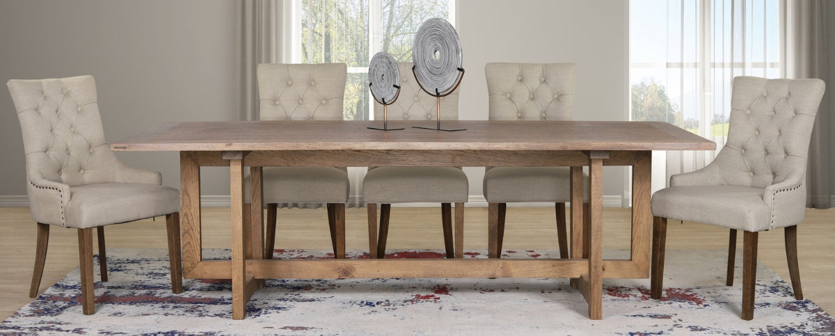 The Duke Dining Chairs perfectly completes the Bolton Wood Top Dining Table Set with their wholesome design and style and create an inviting dining space with their comfortable design that features a wooden border around the upholstered backrest. To create a sturdy and reliable base, the Duchess Dining Chairs feature a solid Oak wood frame that is available in two classic colours, Antique Dark Oak and Antique Natural Oak. These classic wood colours perfectly complement the soft neutral upholstery of the Duke dining room chairs, and adds a warm, inviting feel to your dining room. The premium quality fabric that the Duke Dining Chairs are upholstered in are an innovative smart fabric that has water repellent properties. This advanced feature makes the Duke Dining Chairs easy to clean and maintain, especially if you have children or host dinner parties often.