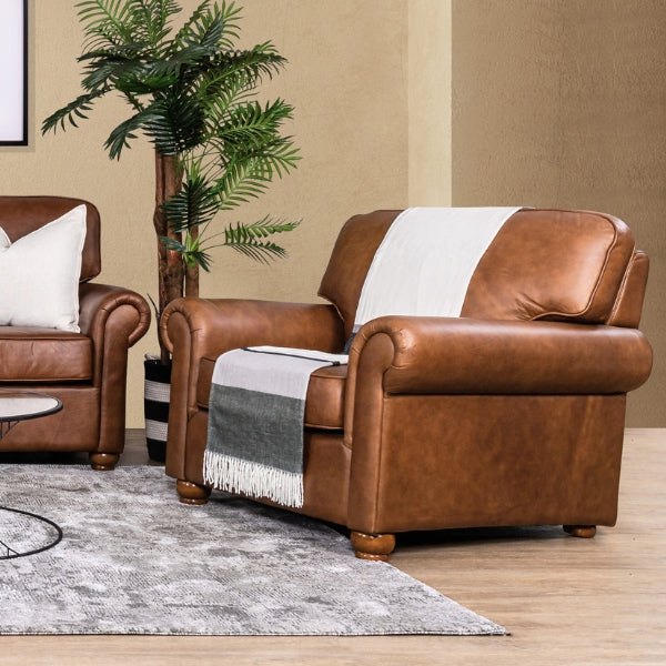 Finished with classic round wooden feet in a warm light brown, this stylish leather couch set blends luxury and sophistication.