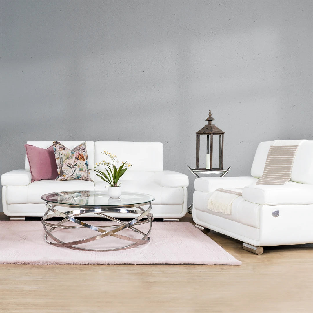 Premium Leather for Lasting Luxury. The Tobago Leather sofa Suite is crafted from the finest genuine leather uppers, sourced from globally renowned leather manufacturers, the Tobago leather couch set offers both durability and sophistication. Available in Grey and White, these versatile tones provide the perfect canvas for styling your home effortlessly.... Modern features & ultimate comfort. Equipped with five adjustable headrests, each seat in this 3 piece leather couch set can be customized for personalized relaxation. The dual-density foam cushions and thick fleecy wadding ensure plush comfort, while the webbing system helps maintain the shape and structure of the seats over time. For added convenience, each sofa in the Tobago leather couch set includes USB ports, allowing you to charge devices without leaving your seat.