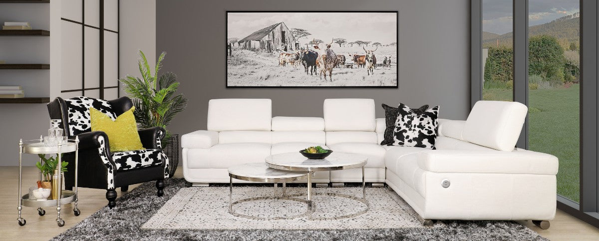 Easily add a classy feel into your living space with the captivating design of the San Miguel Corner Couch. Featuring generous seating, supportive... cushions, backrests and headrests as well as modern accents. This leather corner couch features five spacious seats with adjustable headrests to ensure that everyone has the best seat in your home. The San Miguel Corner Couch has been crafted from genuine leather and has cushions that consist of a 35% density foam to ensure ultimate comfort. The San Miguel Corner Couch is available in various leather colours to perfectly complement your living room. San Miguel Corner Couch is available in Black, Choc, Grey, Red and White. The two USB ports on each side of the San Miguel Corner Couch make it the perfect corner couch to relax and stay connected. The metal legs of the San Miguel Corner Couch adds a modern look and feel to the classic L-Shape of this leather corner couch.