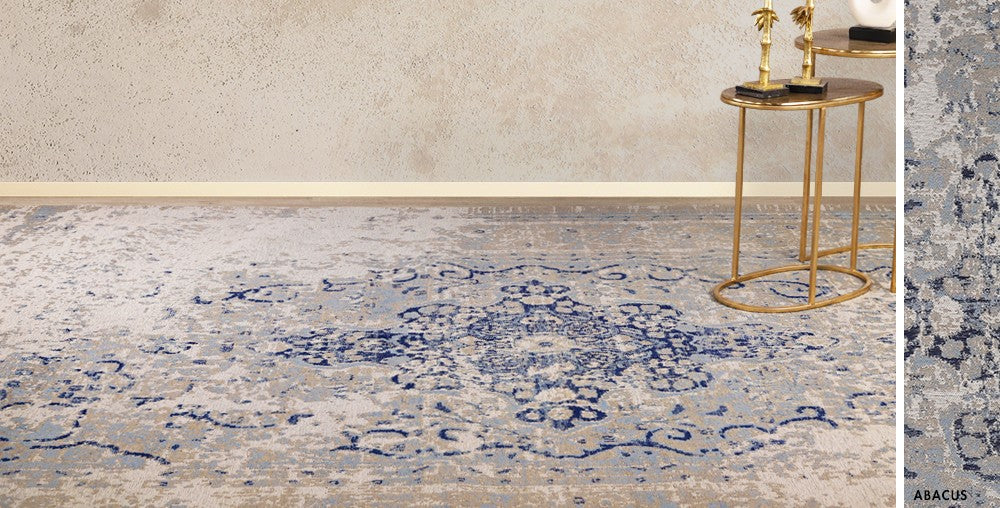 An intoxicatingly deep cobalt blue pattern is woven in a delicate manner throughout the Abacus rug with a soft teal base shade. The rug features specks of a mellow beige and brown tone, providing a sense of extravagance to your home.