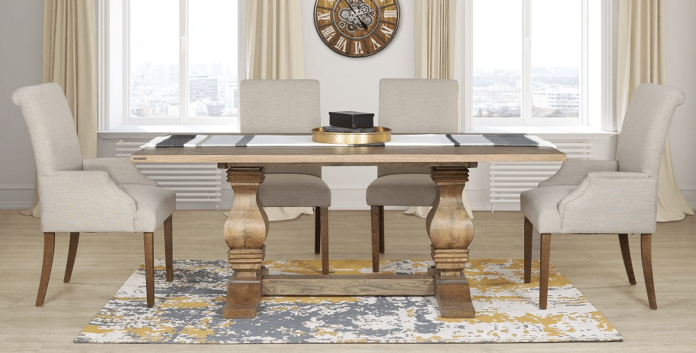 The Belmont dining table showcases a classic two pillar base. The base of the Belmont dining table is crafted from solid Oak and available in two colour options, Antique Dark Oak and Antique Natural Oak.