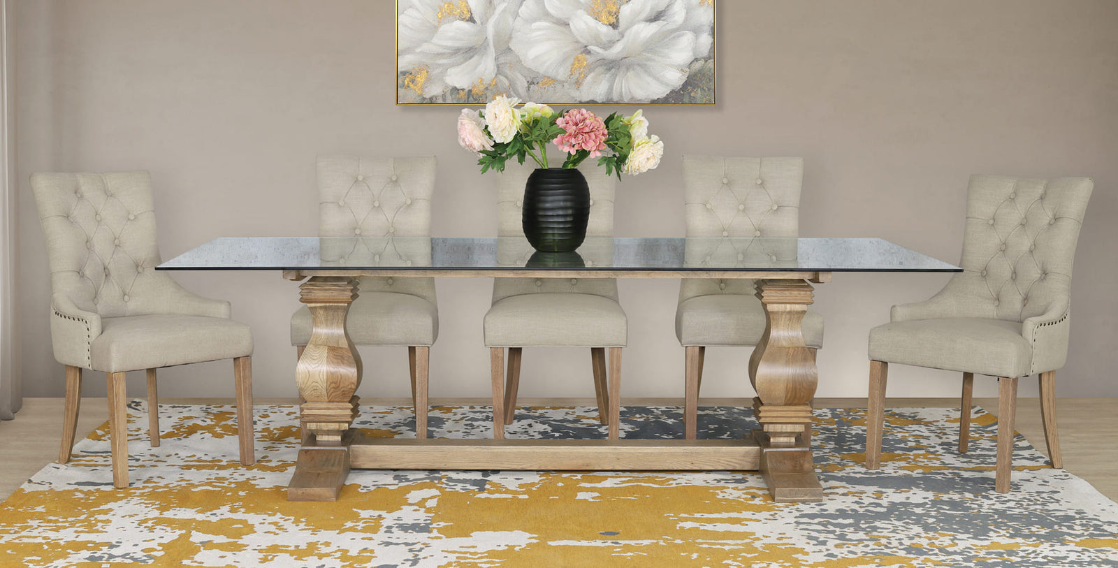 Elevate your dining space with the Belmont 1.9m Glass Top Dining Table, a perfect balance of elegance and durability.