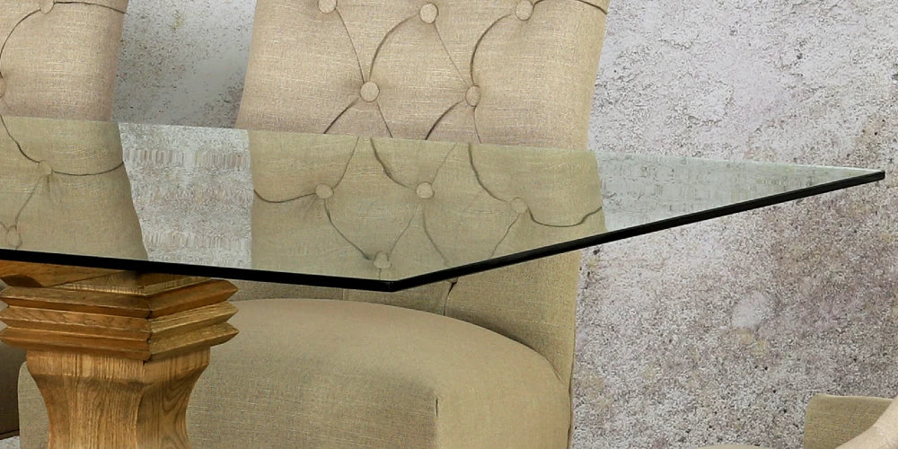 The Belmont Glass 6-Seater Dining Table is perfect for family dining. The glass top is easy to clean and does not absorb or allow any liquids to pass through it, meaning those accidental spills are quick and easy to clean, and the look of the Belmont Glass Dining Table is not affected or ruined. Available in two beautiful colours, Antique Dark Oak and Antique Natural Oak, the Belmont Glass Dining Table perfectly complements the look and aesthetic of any dining room. The deep button detailing of the Duchess dining chair is guaranteed to elevate the look and feel of your dining room to new heights by adding a unique design element that will instantly catch the eye of all of your guests. To create a sturdy and reliable base, the Duchess Dining Chairs feature a solid Oak wood frame that is available in two classic colours, Antique Dark Oak and Antique Natural Oak.