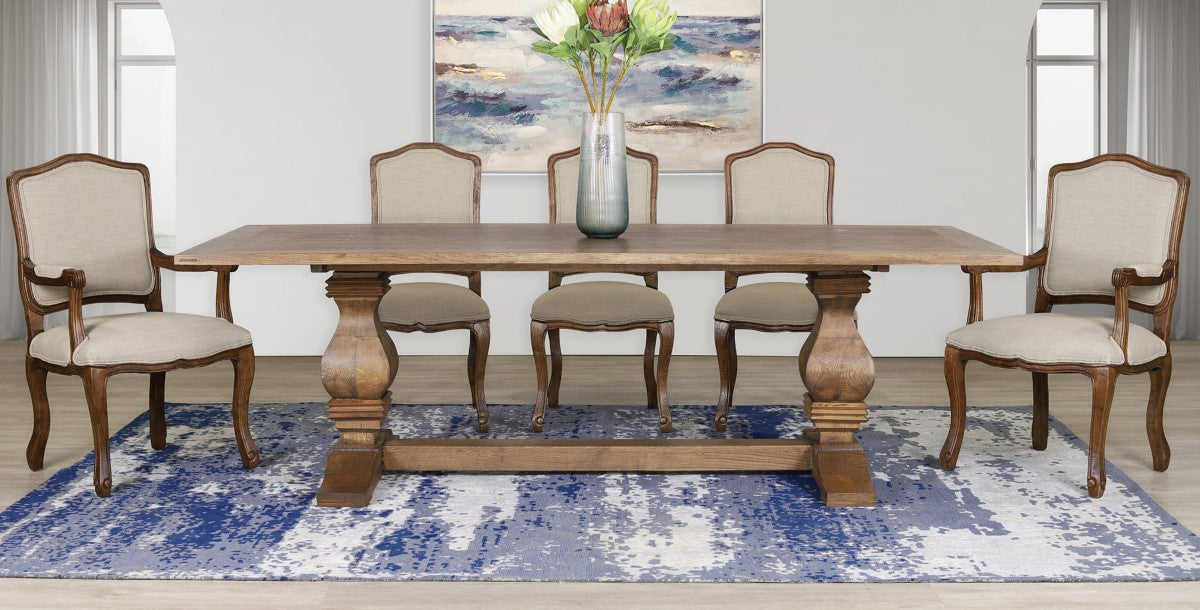 The Belmont dining table showcases a classic two pillar base. The base of the Belmont dining table is crafted from solid Oak and available in two colour options, Antique Dark Oak and Antique Natural Oak.