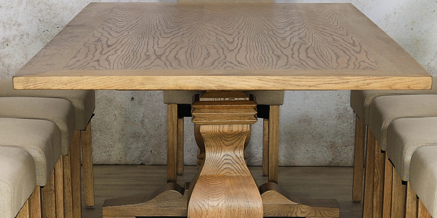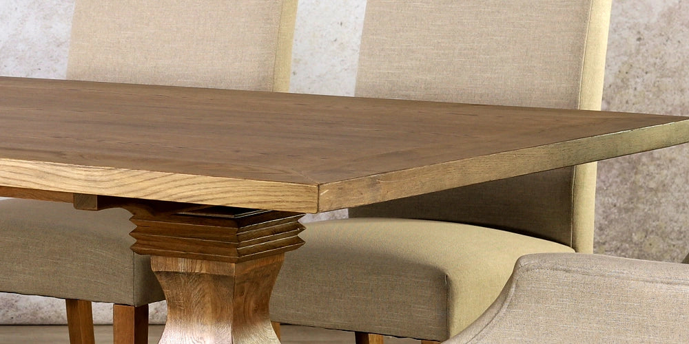 The Belmont dining table showcases a classic two pillar base. The base of the Belmont dining table is crafted from solid Oak and available in two colour options, Antique Dark Oak and Antique Natural Oak.