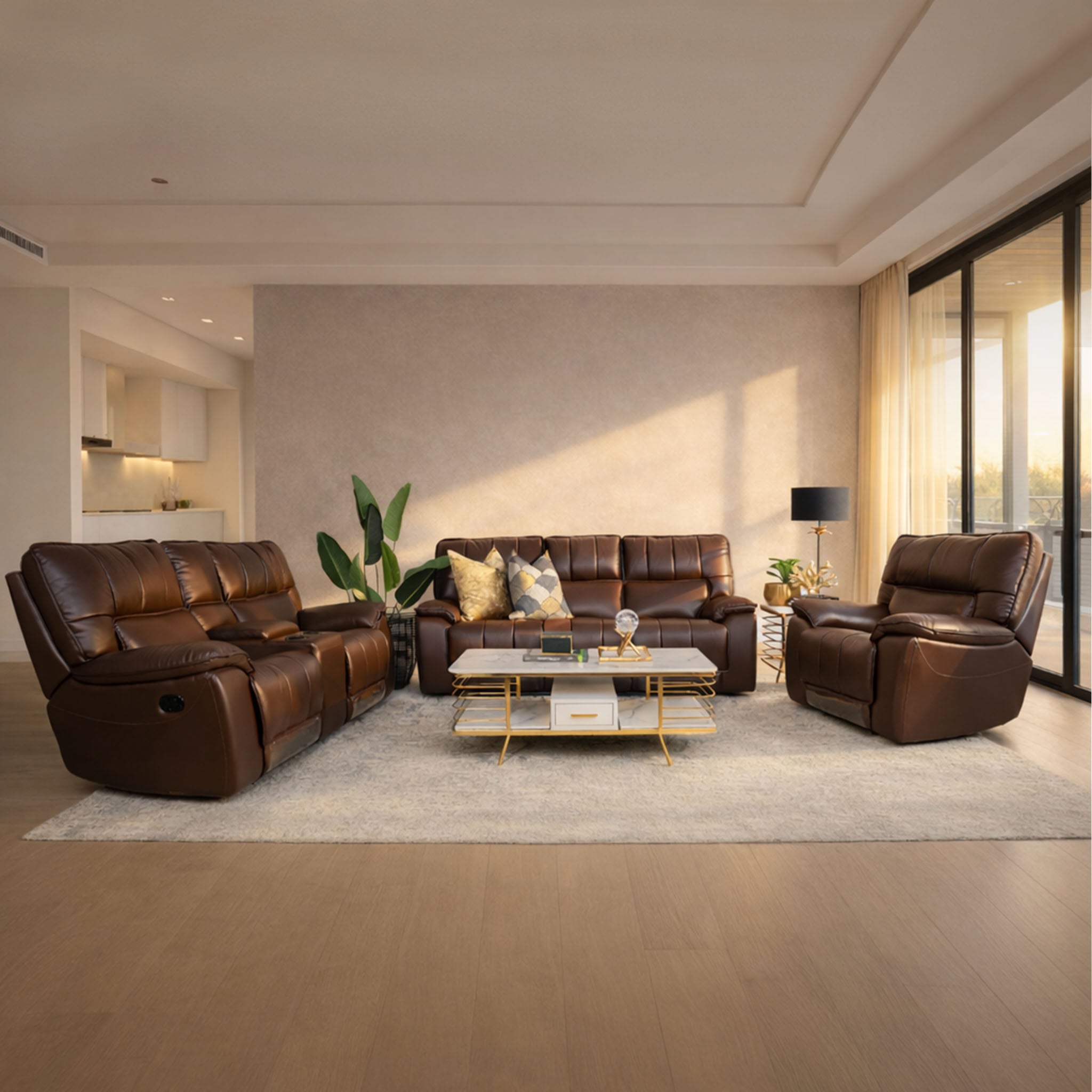 Features five smooth-action recliners, wrapped in full genuine semi-aniline leather, with layered foam comfort offering durable support. Supports up to 135 kg per seat. Pricing excludes Décor and Accessories.