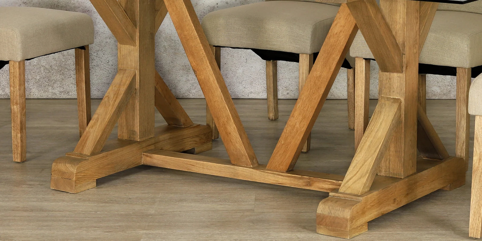 The Berkeley dining table features an X base, this refers to the X shaped legs that it showcases. The X base adds greater stability to this dining table. This base is crafted from solid Oak and is available in two colour options, Antique Dark Oak and Antique Natural Oak.