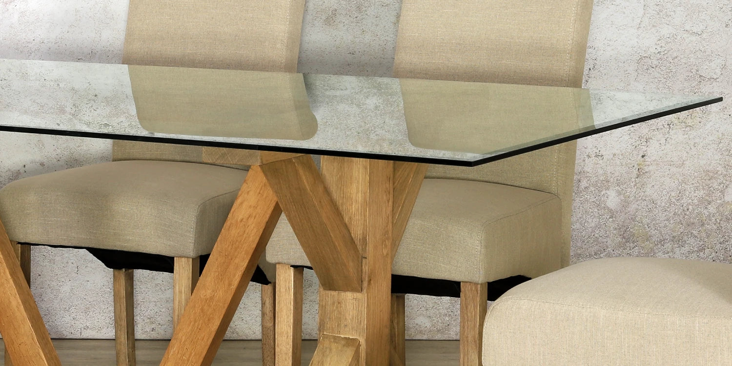 Elmwood is soft hardwood, meaning it is quite durable and tough but is softer than other hardwoods. The interlocking grains of the Elmwood add to its durability and prevent the wood from splitting. The Berkeley Glass Dining Table is available in two colours, and whether you like dark or light wood, you can achieve any aesthetic in your dining room, Antique Natural Oak, is a lighter-toned wood, and Antique Dark Oak, is a darker toned wood. The Berkeley Glass Dining Table is the perfect dining table for family dining as the glass top is easy to clean. This is due to the fact that glass does not absorb or allow liquids to pass through it.