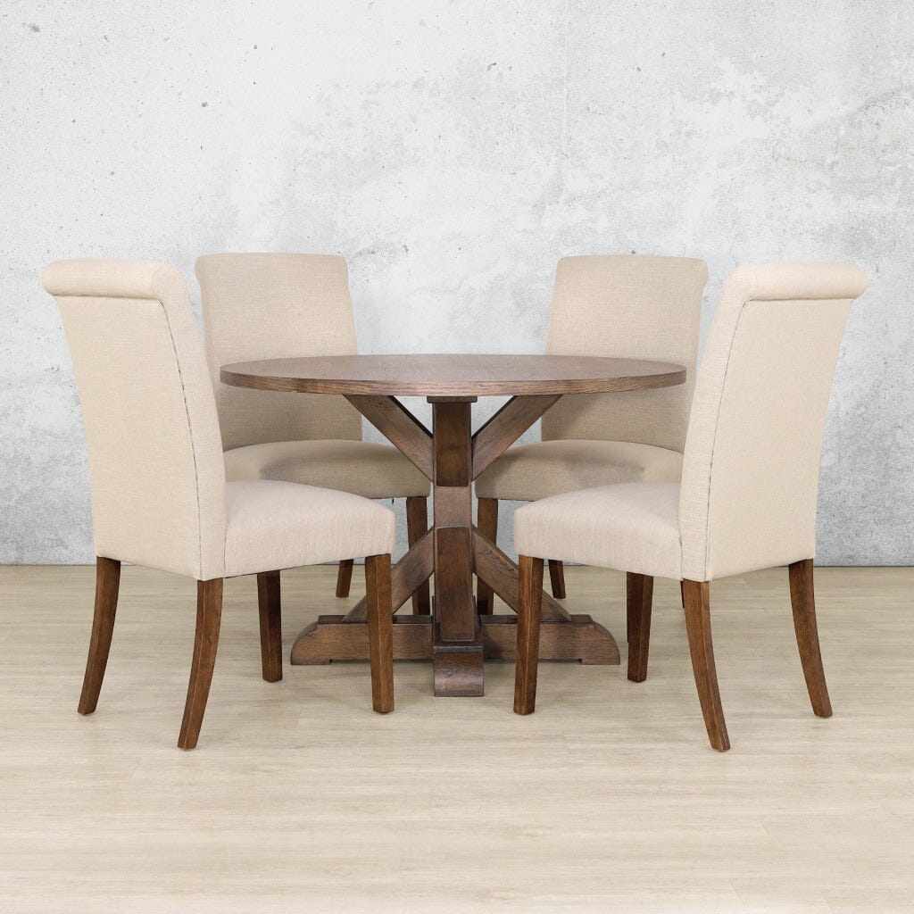 Refined and timeless, the Berkeley Round & Baron 4 seater dining room set brings elegance and comfort into perfect balance, within your dining area. At 1.2 metres in size, the round Berkeley dining table is crafted from solid Oakwood and finished with an elegant Oakwood veneer, showcasing both durability and natural beauty. Its signature X-base design with bold, X-shaped legs adds a modern architectural flair to any space.
