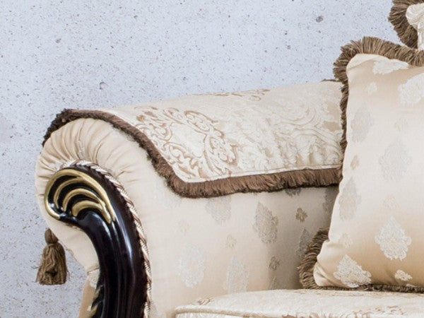 The timeless charm and expert craftsmanship of the Berlin Fabric Sofa features intricately designed wooden frames with golden accents that effortlessly complement the golden beige fabric. The unique, jacquard pattern on the seats in a darker golden shade and dark golden tassel trimming around the scatter cushions makes the... Berlin Fabric Sofa is the most luxurious, timeless sofa on the market.