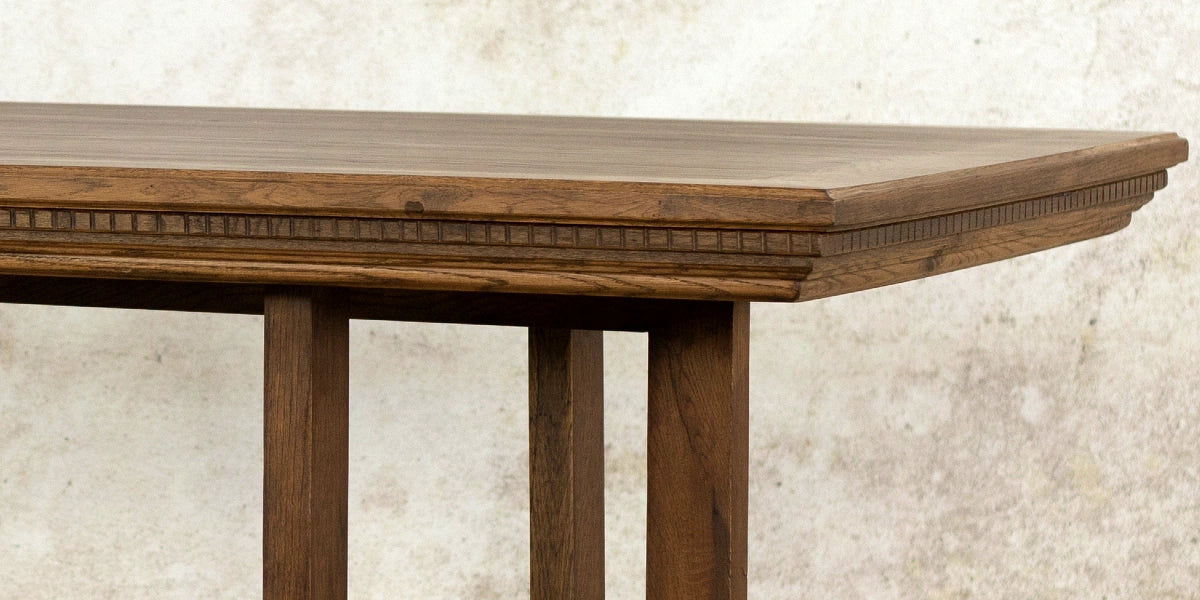 The edging of the Bolton dining table has been veneered in Oak wood, that has a maximum thickness of three millimetres. The centre of the tabletop is crafted with an MDF centre which is veneered in Oak wood to prevent water from soaking into the wood.