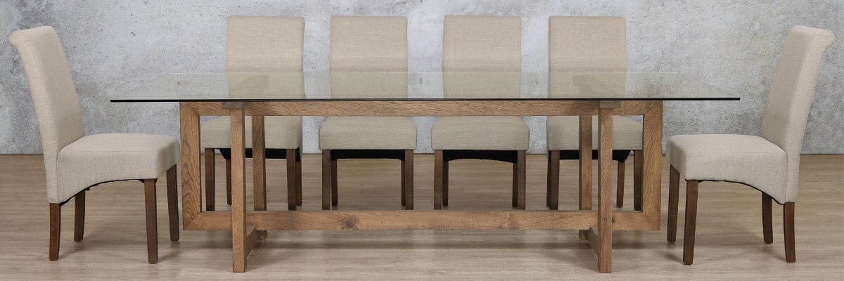 Available in Antique Dark Oak or Antique Natural Oak, the Bolton Glass 10-Seater Dining Table easily fits into any dining room, no matter the colour scheme. Comfortably fit 10 guests at your dinner table and enjoy an intimate dinner. The Bolton Glass 8- or 10-Seater Dining Table is a luxurious modern dining table that celebrates the raw natural beauty of the visible grains in Elm wood base and celebrates the illusion of light and space that the glass table top gives off.