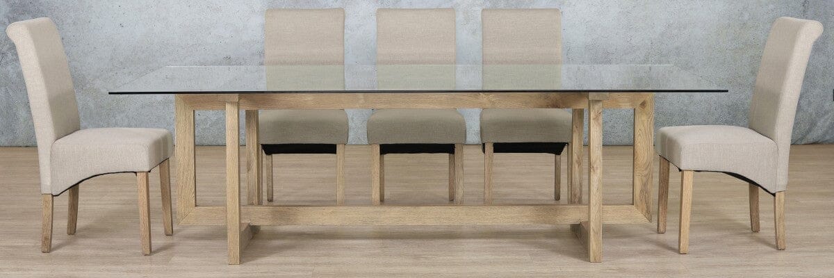 Available in Antique Dark Oak or Antique Natural Oak, the Bolton Glass 8-Seater Dining Table easily fits into any dining room, no matter the colour scheme. Comfortably fit 8 guests at your dinner table and enjoy a small intimate dinner. The Bolton Glass 8- or 10-Seater Dining Table is a luxurious modern dining table that celebrates the raw natural beauty of the visible grains in Elm wood base and celebrates the illusion of light and space that the glass table top gives off.