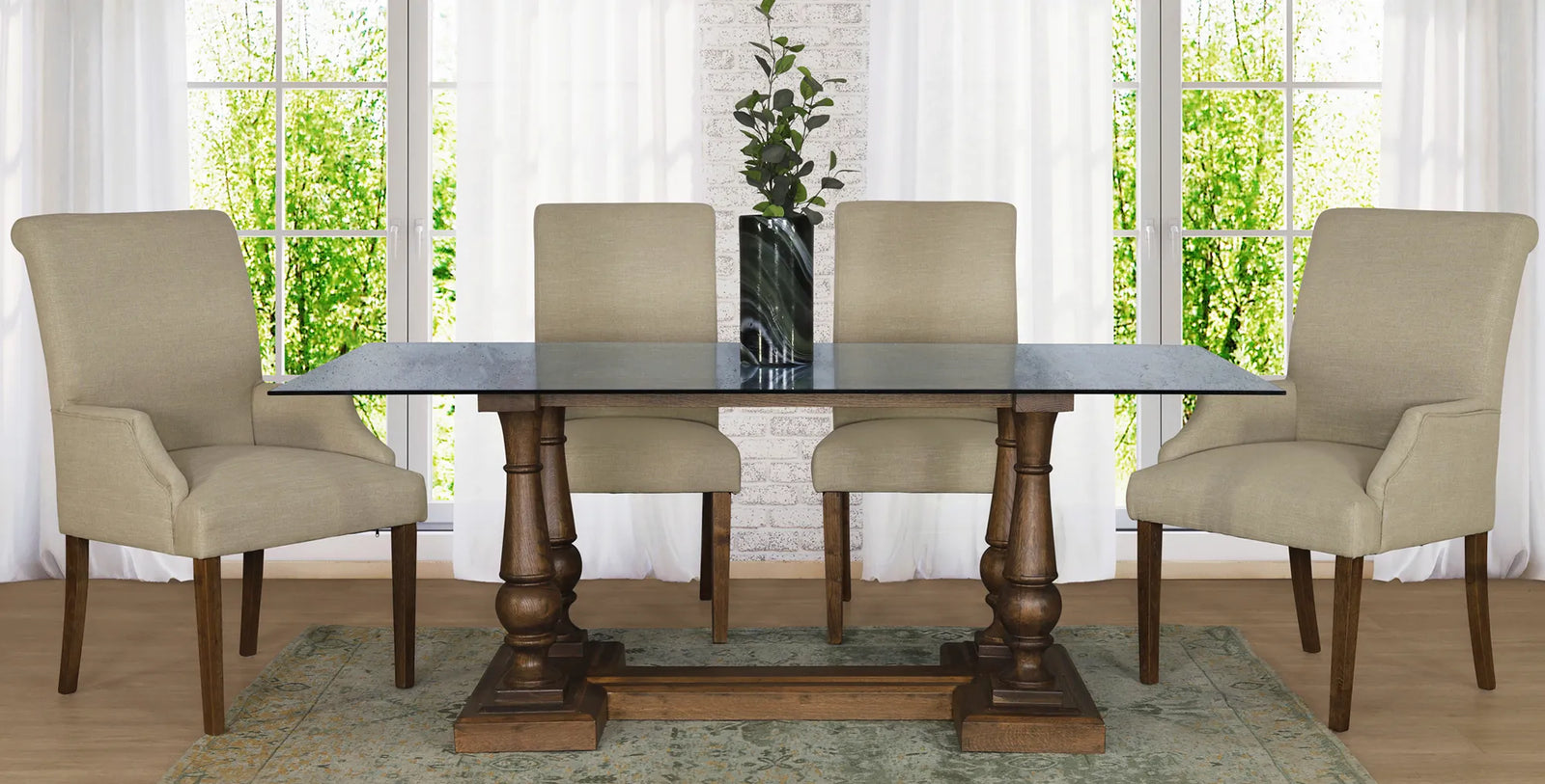 The Charlotte Glass 6-Seater Dining Table features a clear glass table top that creates an open, airy feel in your dining room and gives the illusion of more open space. Available in either Antique Dark Oak or Antique Natural Oak, the Charlotte 6-Seater Dining Table perfectly matches the Baron Dining Chairs and Baron Carver Dining Chairs. The Charlotte Glass 6-Seater Dining Table is beautifully designed and crafted from Elm wood. Elm wood is specifically used in crafting furniture due to its strength and durability, as well as its natural, authentic wooden look and feel.