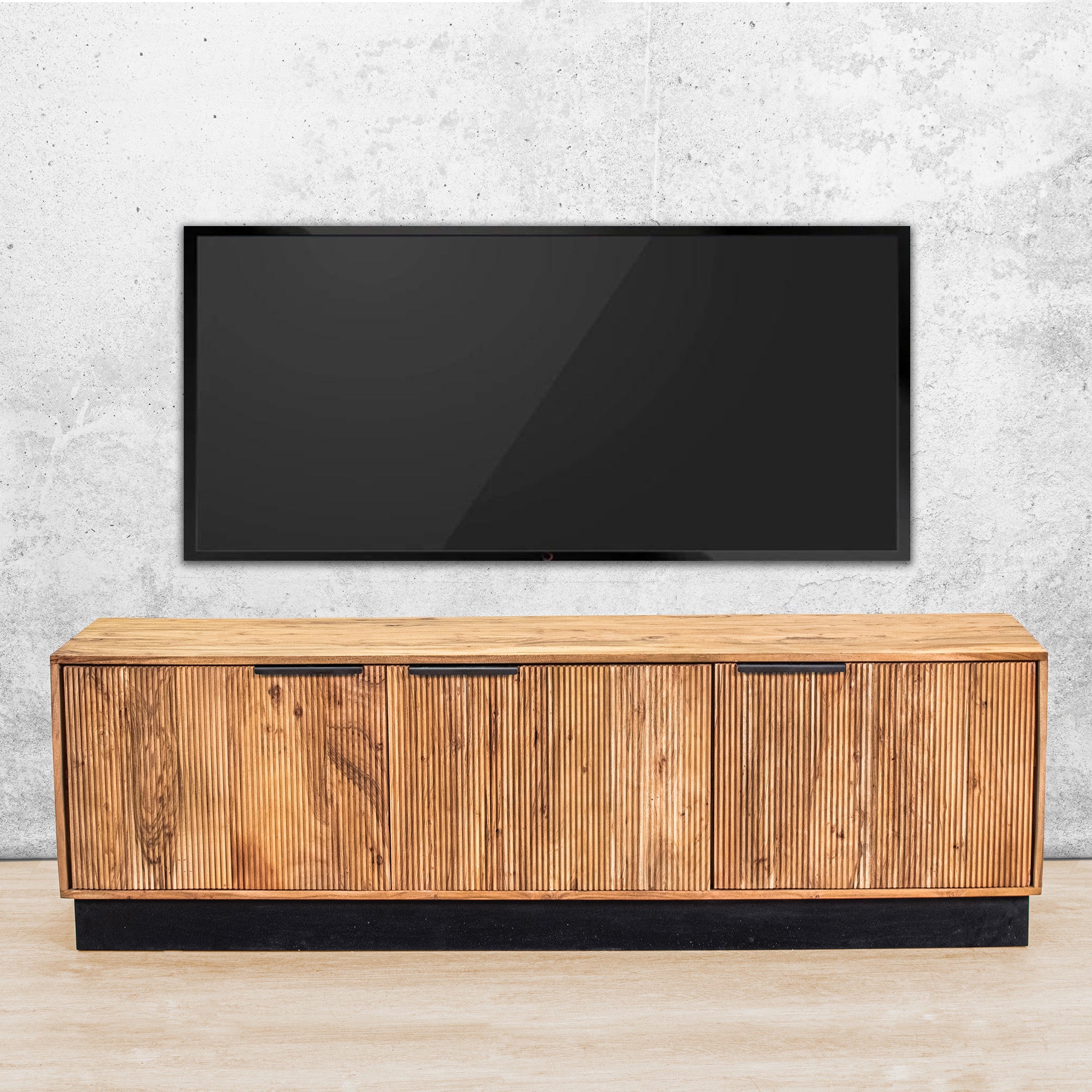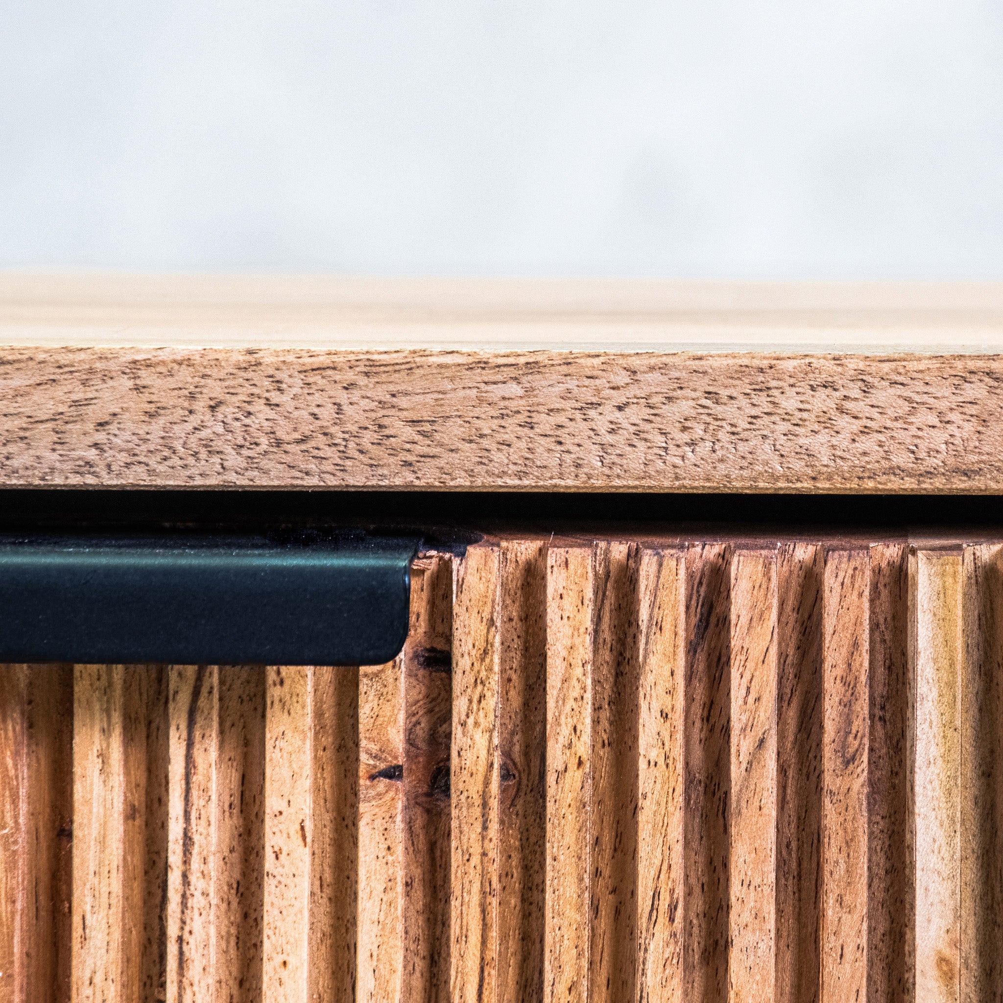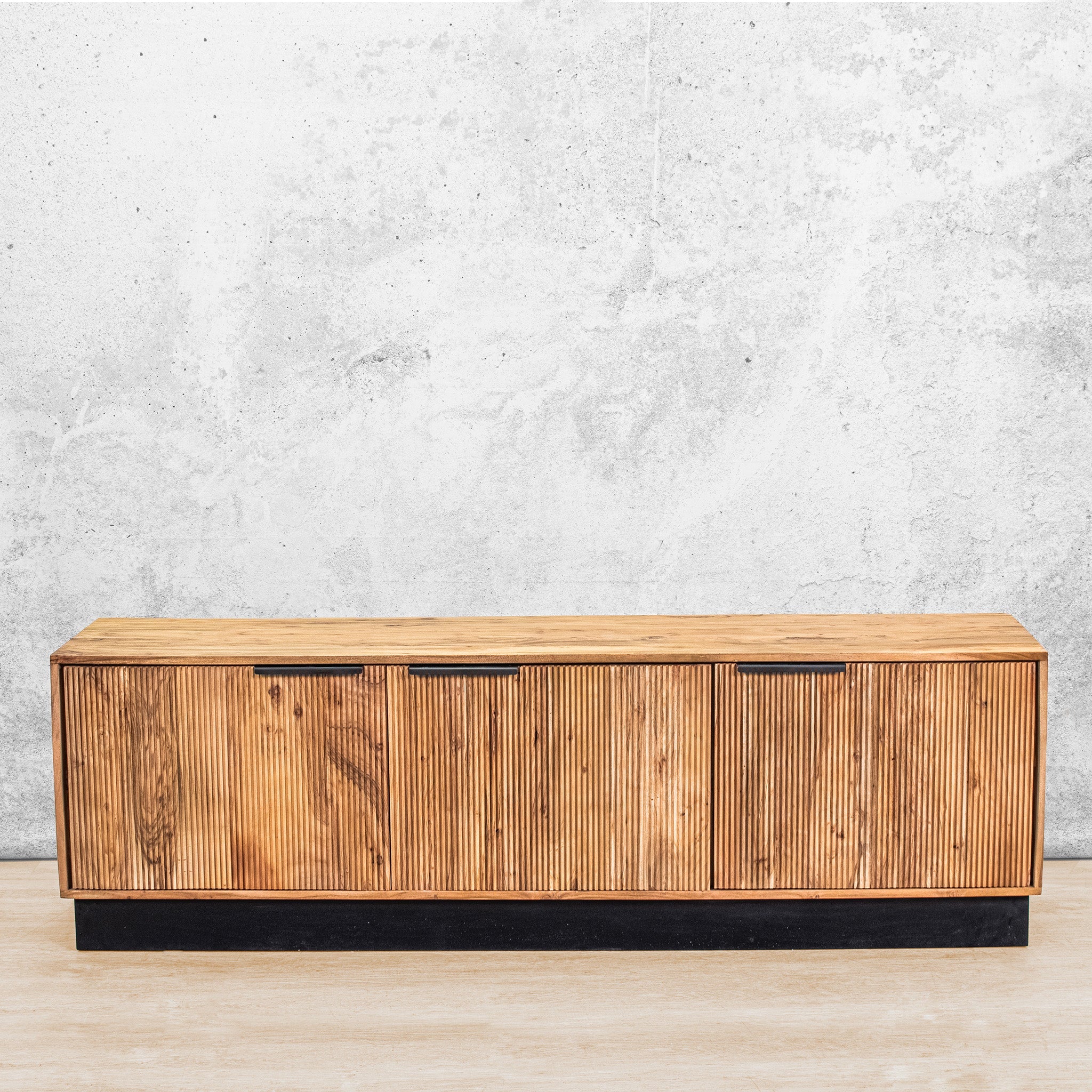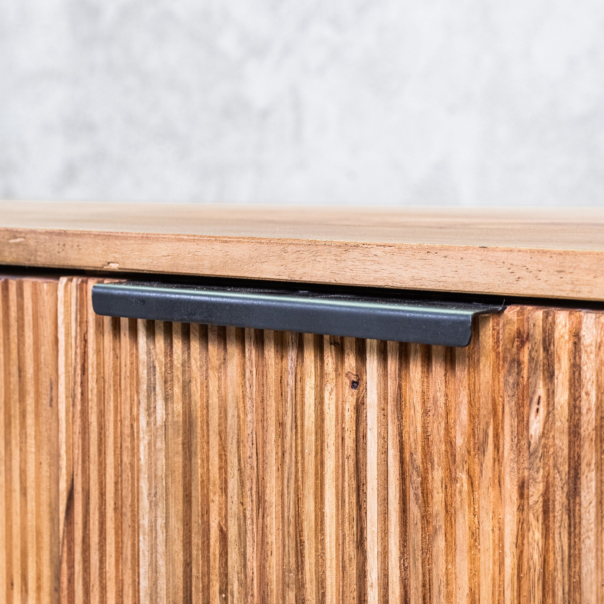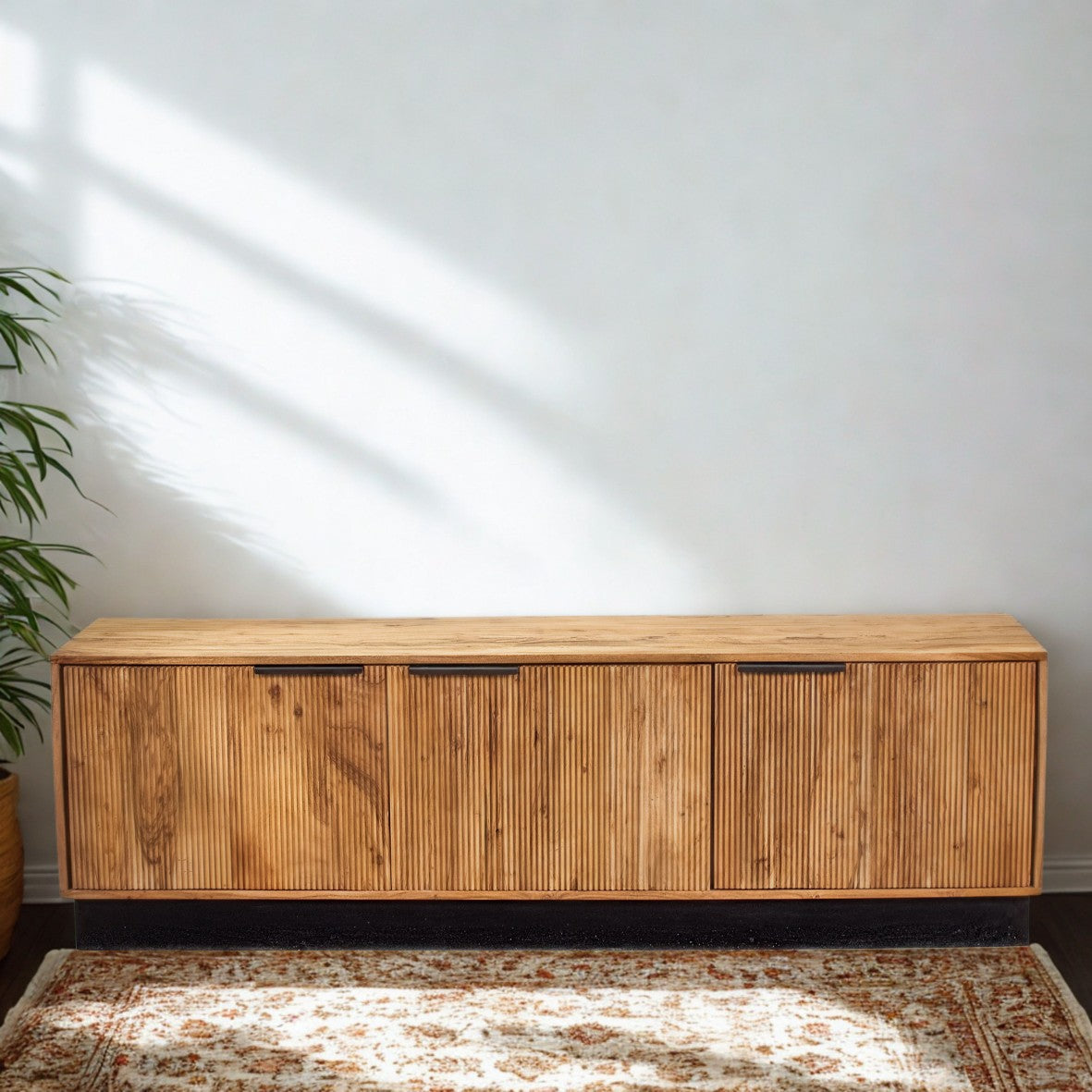 The standout feature is the reeded front panels, with vertical grooves that add subtle texture and a sense of depth. Paired with the black base and slender black metal handles, the design achieves a striking balance of warmth and contrast, bringing a refined, minimalist aesthetic to your living room.