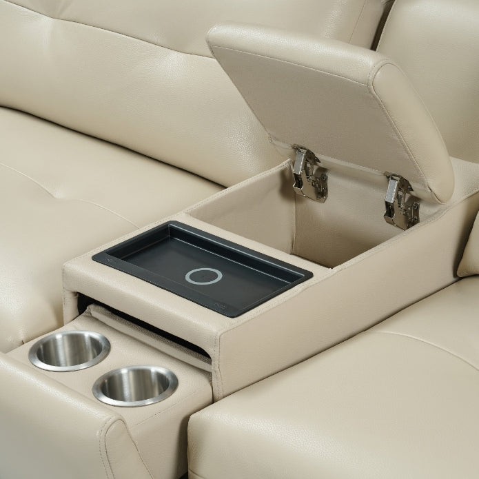 This 6-piece sectional includes two power motion beds, fitted with the Easyctrl mechanism for smooth, reliable motion at the touch of a button, offering a full-body lounging experience. A smart console adds convenience with wireless charging, hidden cup holders, discreet storage, and USB-Type C ports on either side.