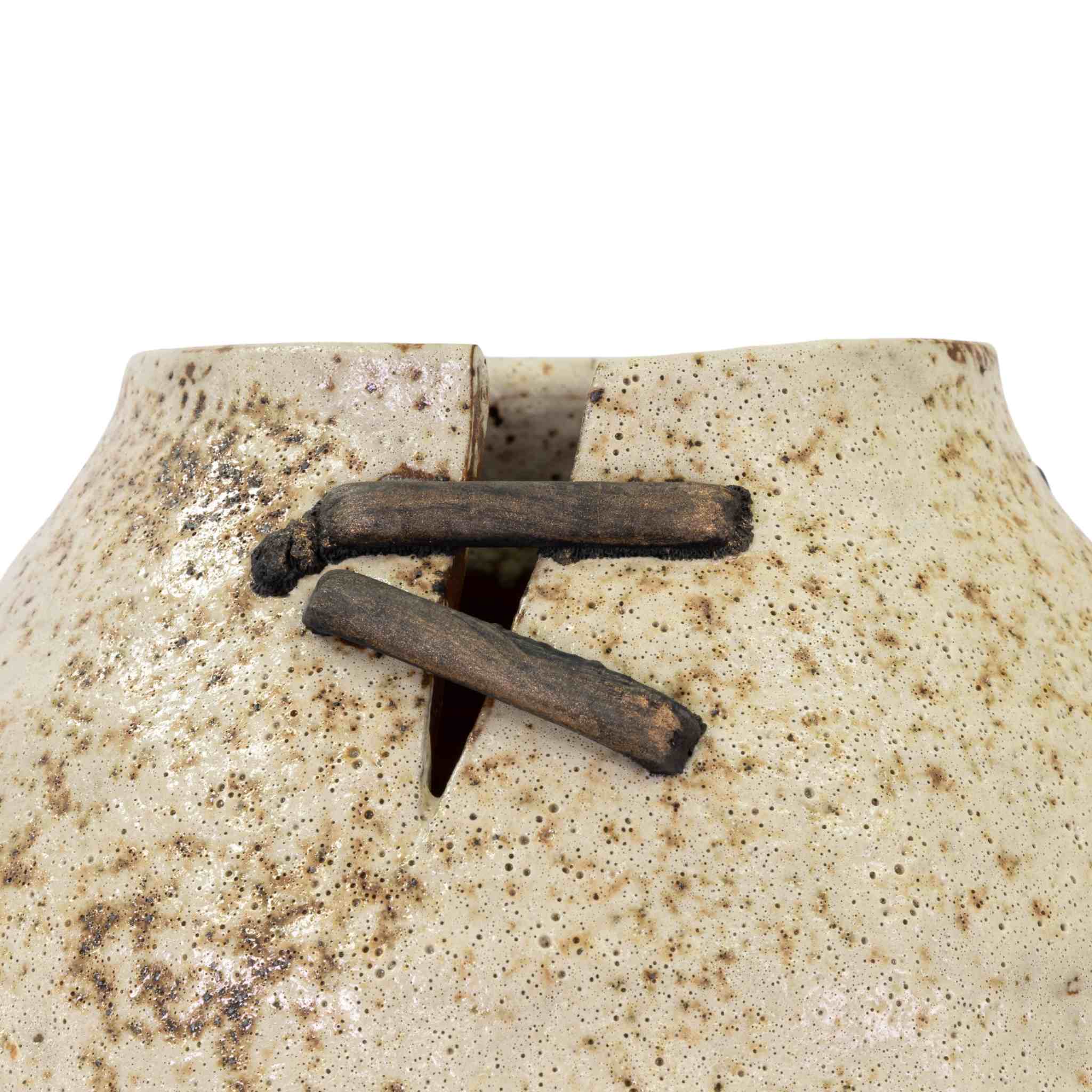 The Safi Vase – Large is a striking decorative vase that blends organic form with artisanal detail, perfect for elevating your home décor. Its rounded, cream-speckled body features a tactile, pitted texture and a distinctive vertical crevice, held together with rugged, metallic-toned ceramic ties for a repaired, wabi-sabi aesthetic.