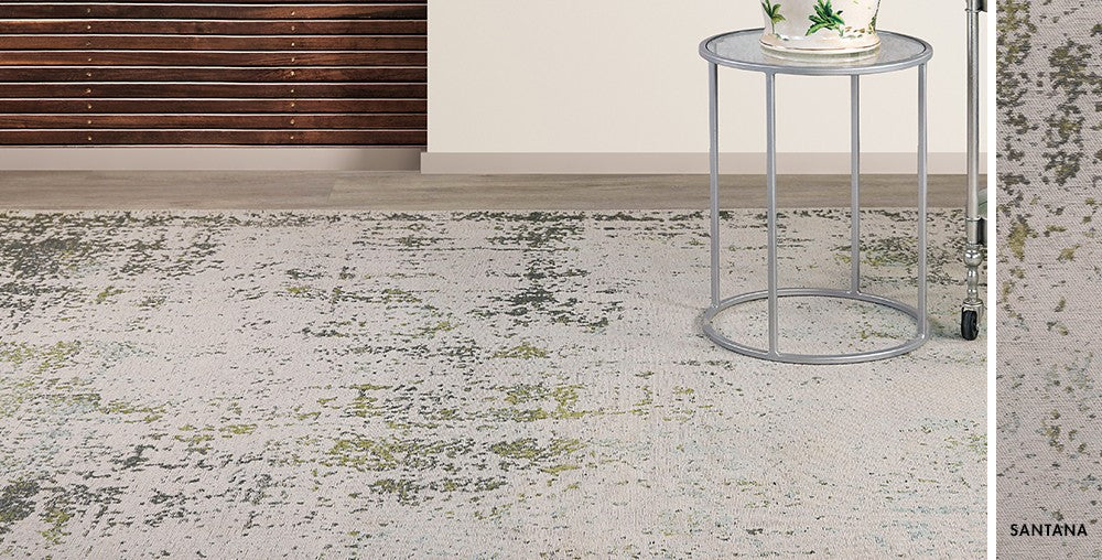 The Santana rug in antique jade is woven expertly with a neutral-shaded selection of chenille and cotton fabrics, which brings a sense of sophistication to living spaces. The rug is scattered with slight specks of light and dark green tones.