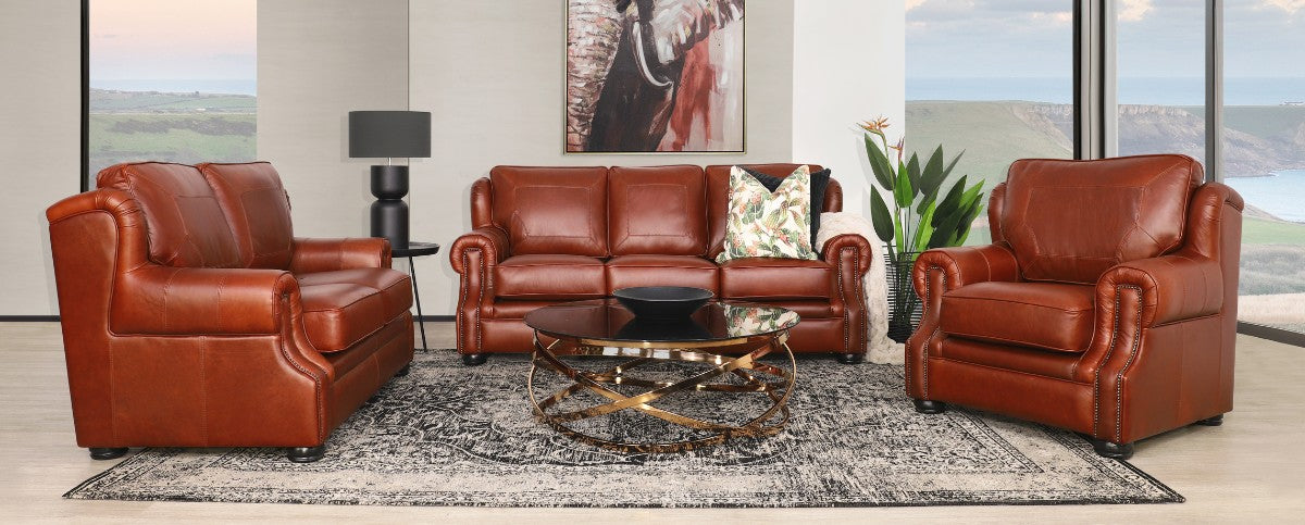 The prestigious Highpoint Leather Sofa Suite is adorned with studded detailing around the elegantly scrolled armrests, and features a beautiful square design on the backrest cushions. Crafted from the finest quality full grain genuine leather, the Highpoint Leather Lounge Suite is the perfect lounge suite for your family living room.