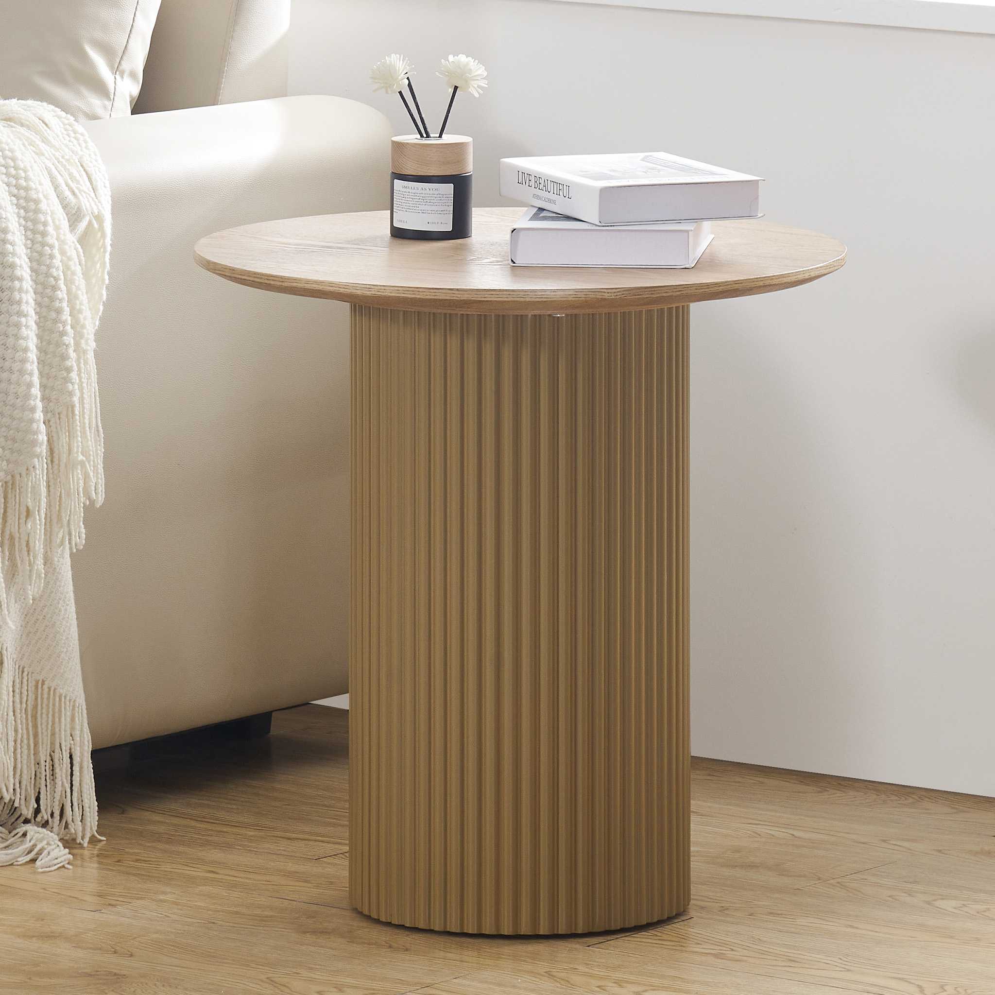 Its circular tabletop, crafted from engineered wood with a natural wood veneer, is smooth to the touch and finished in a warm, light wood tone. Subtle grain patterns add visual depth, inviting closer inspection and creating a natural, calming feel. Supporting its sturdy, veneered wood tabletop is a single, fluted cylindrical base, finished in a muted natural hue and crafted from a high-quality moulded material with a refined wood-look finish. The vertical ribbing adds texture and visual interest, giving the table a modern, sculptural quality that catches the eye without overwhelming the room.