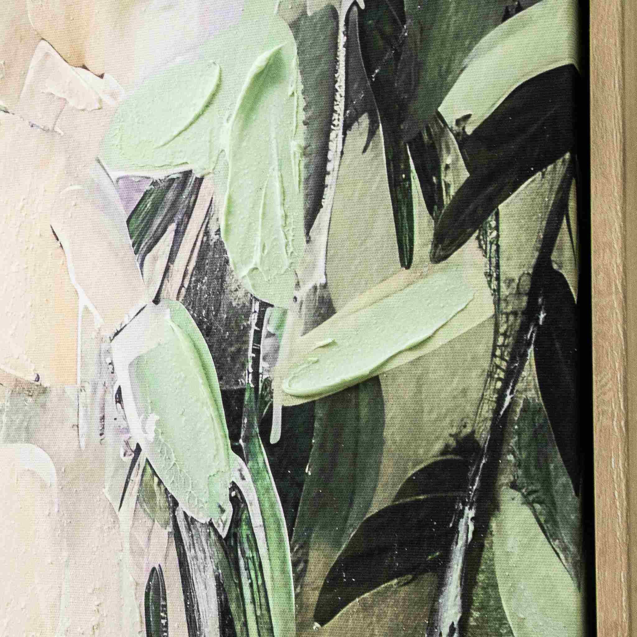 In muted, earthy tones of sage, olive, and deep forest greens, with soft creams, pale yellows, and subtle hints of dusty rose, the thick, sculptural brushstrokes bring each leaf and bloom to life. The heavy impasto technique adds texture and dimension, inviting the eye to explore the layered foliage while giving the canvas a tactile, almost touchable quality.