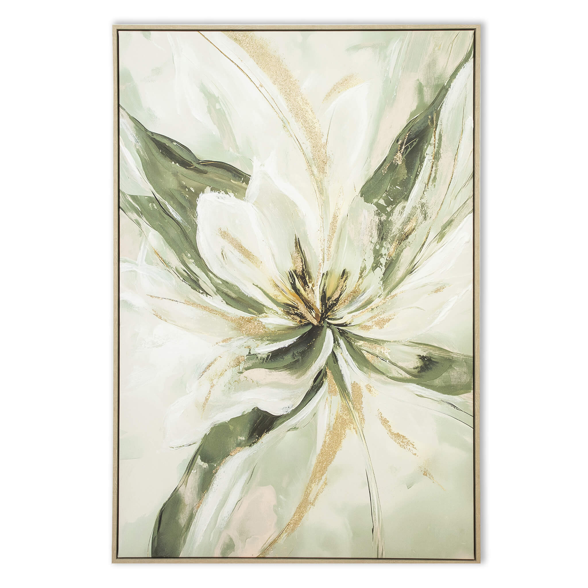 Inspired by the legend of King Midas, this piece turns simplicity into luxury, offering a subtle glow that catches the light as you move through your home. With hand-painting and textured brushwork, every detail feels alive - from the raised impasto petals to the graceful glint of gold. The natural wood frame adds a modern finish, enhancing the softness of the design while keeping the focus on its luminous centre.