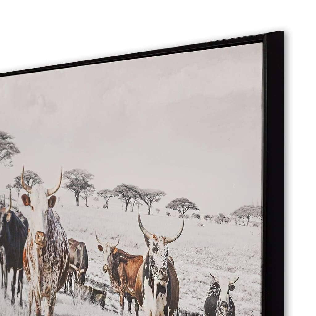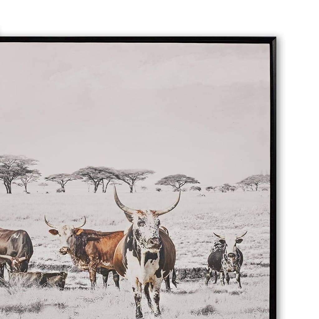 The Nguni Fields artwork pictures a herd of curious Nguni cattle grazing in the warm African sunshine. This proudly African artwork highlights the natural beauty of the Nguni cattle and draws inspiration from unique patterns of the Nguni hides to create an intriguing piece of art. With the background of the artwork featuring a farmland style landscape that has been washed out, it draws your attention towards the herd of Nguni cows in the foreground. Perfect for South African homes, the Nguni Fields artwork perfectly captures the beauty and symbolism of the Nguni herd.
